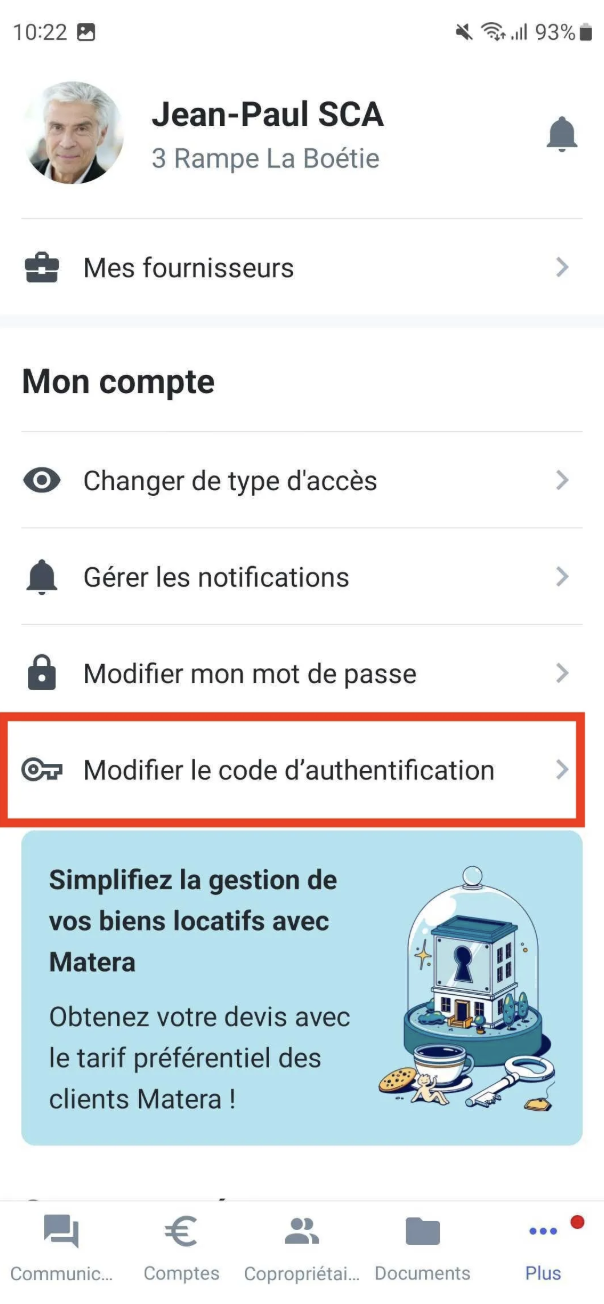 Dans l’application, allez dans “Plus” > “Changer le code d’authentification”.