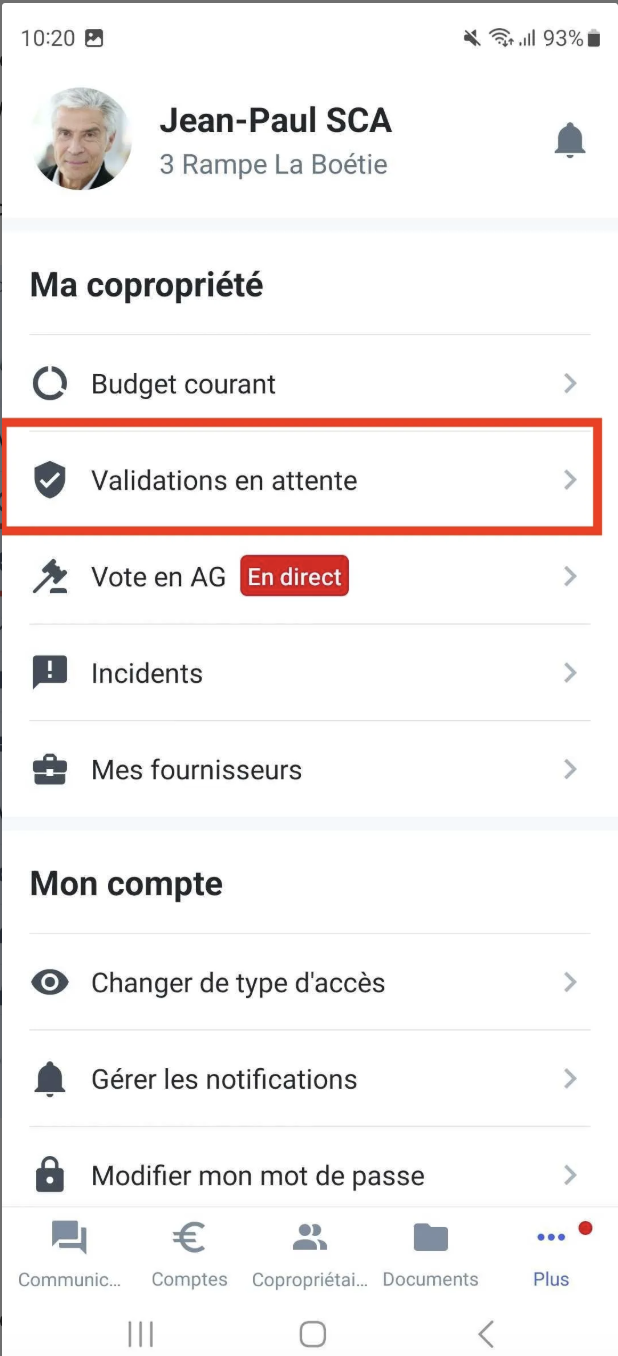 Ouvrez l’application Matera, puis allez dans “Plus” > “Validations en attente” pour accéder à l’écran de saisie du code.