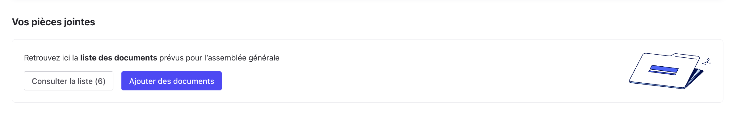 Vous pouvez joindre des documents en cliquant sur « Ajouter des documents », dans la première étape de l’AG :