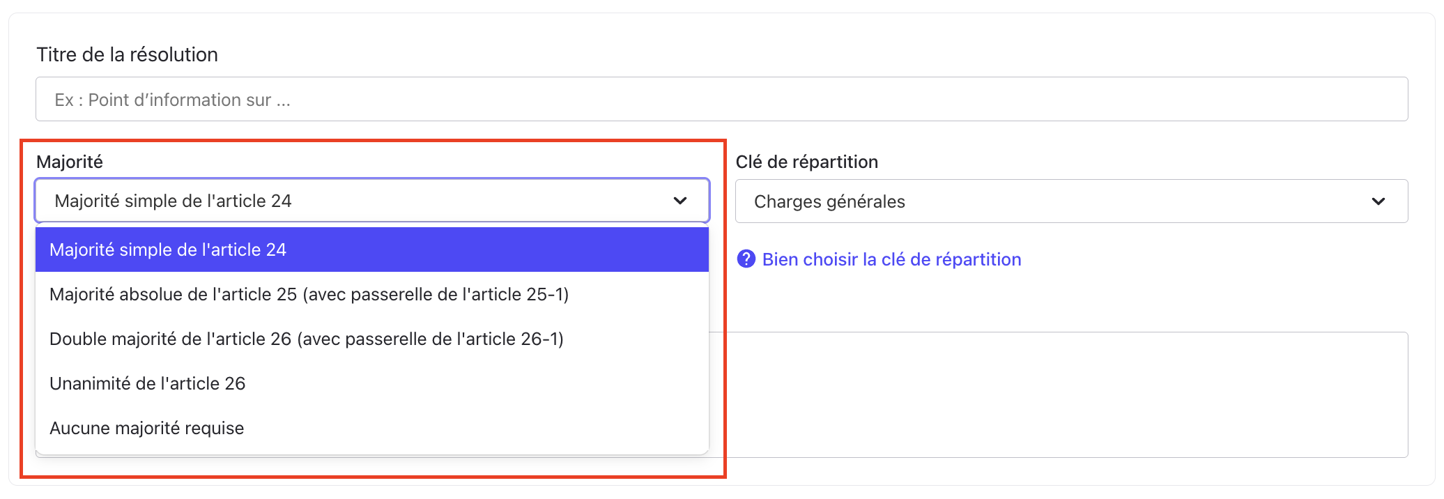 Si vous créez une résolution personnalisée, alors vous pourrez définir la majorité requise depuis la liste déroulante, dans l’édition de la résolution :