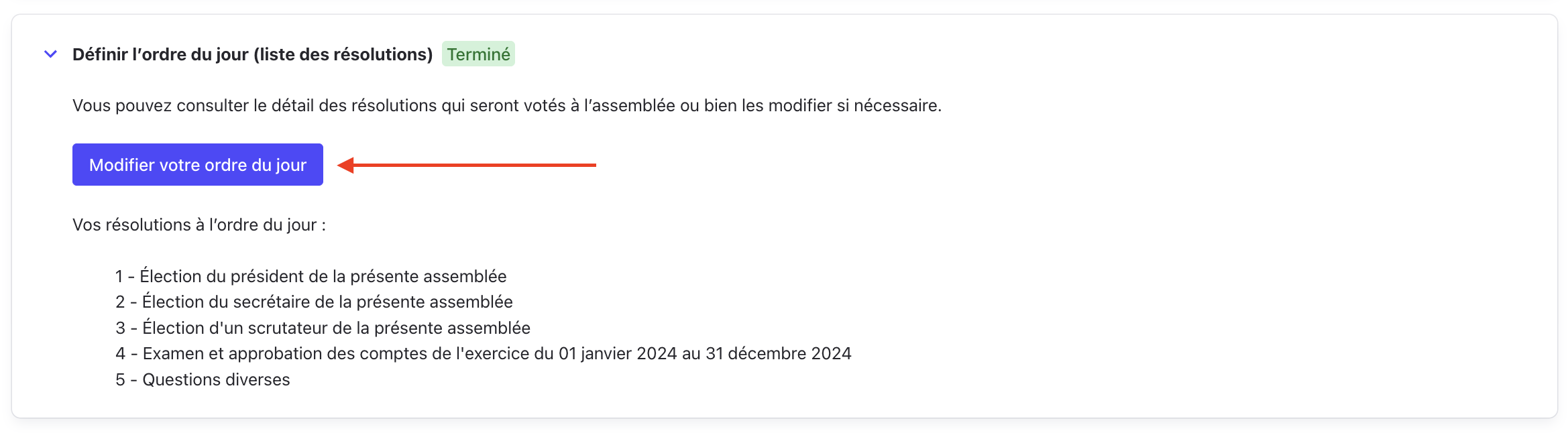 Pour ce faire, il vous suffit, dans l’étape 1 de l’AG, de cliquer sur « Définir l’ordre du jour » puis « Modifier votre ordre du jour » :
