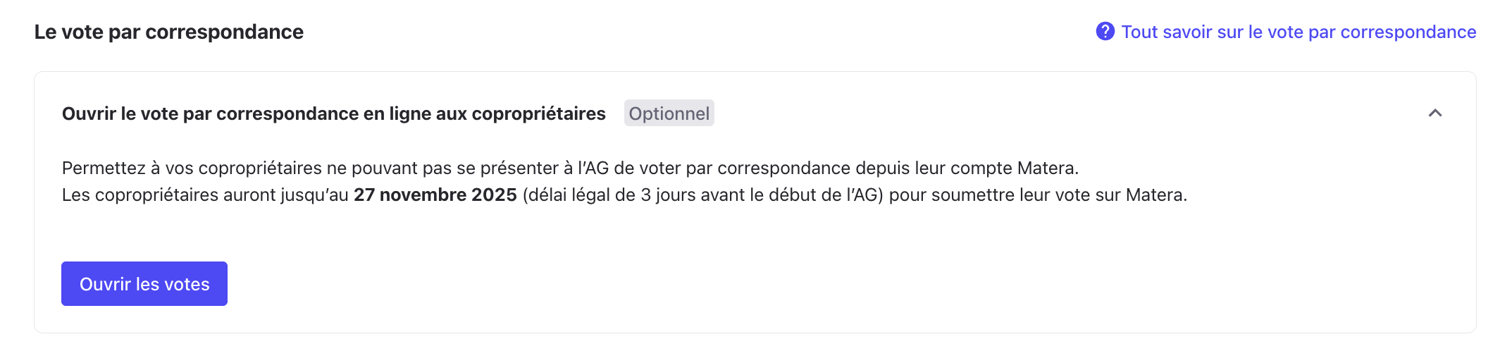 Chaque copropriétaire ne pouvant pas se rendre à l’AG a la possibilité de voter par correspondance. Ils peuvent voter grâce au formulaire joint à la convocation, mais ils peuvent également voter en ligne depuis Matera.